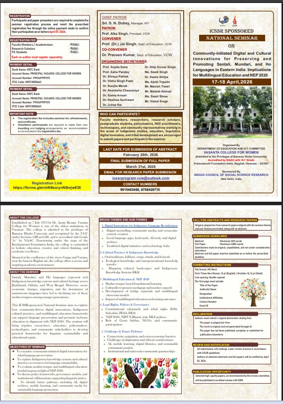 | 3 | ICSSR Sponsored Two Days National Seminar | ICSSR Sponsored National Seminar on Community-Initiated Digital and Cultural Innovations for Preserving and Promoting Santali, Mundari, and Ho Languages in Eastern India: Implications for Multilingual Education and NEP 2020 (April 17-18, 2026) | 18 Feb 2026, 02:05 PM | |