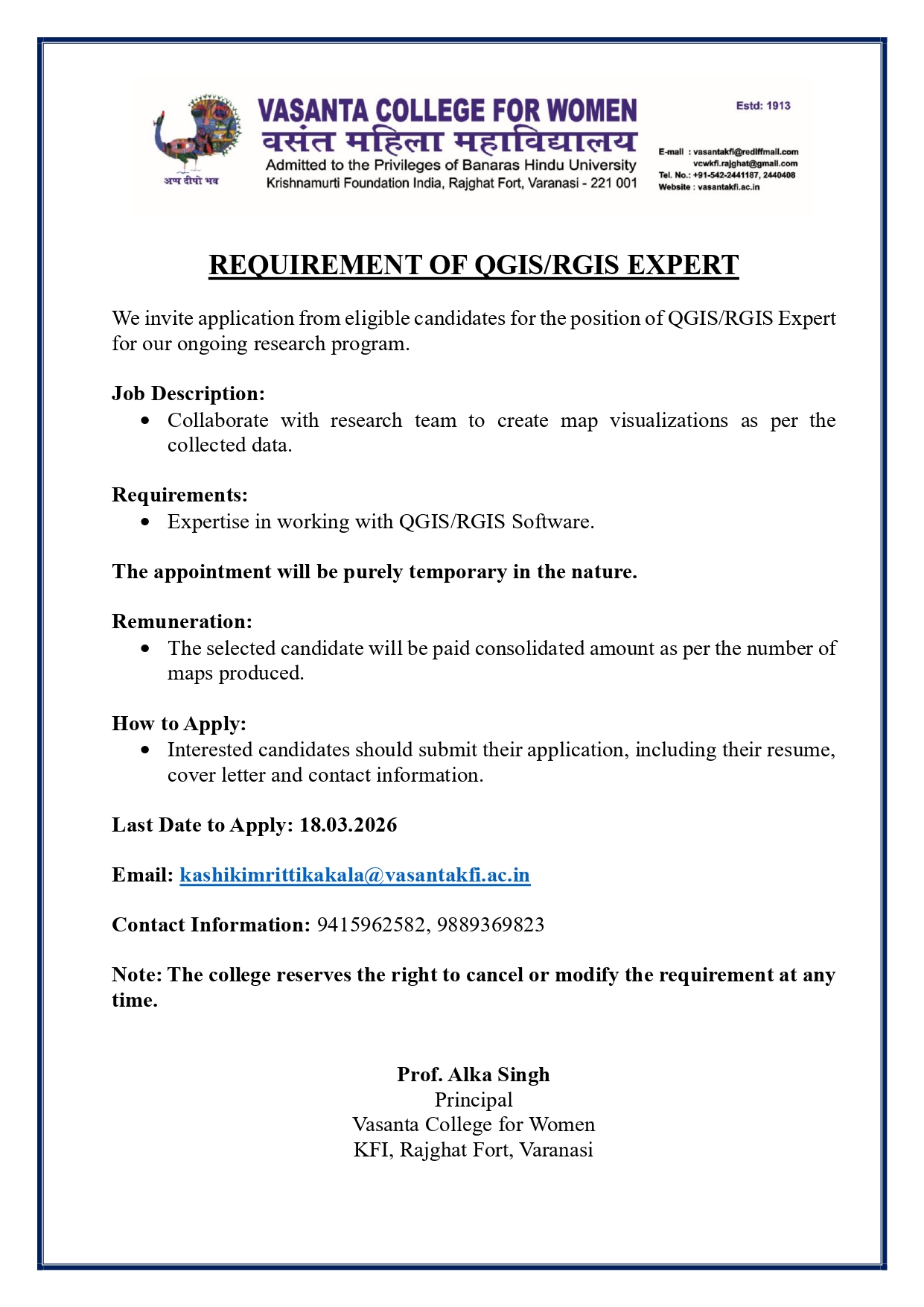 | 2 | REQUIREMENT OF QGIS/RGIS EXPERT | We invite application from eligible candidates for the position of QGIS/RGIS Expert for our ongoing research program. | 10 Mar 2026, 10:49 AM | |