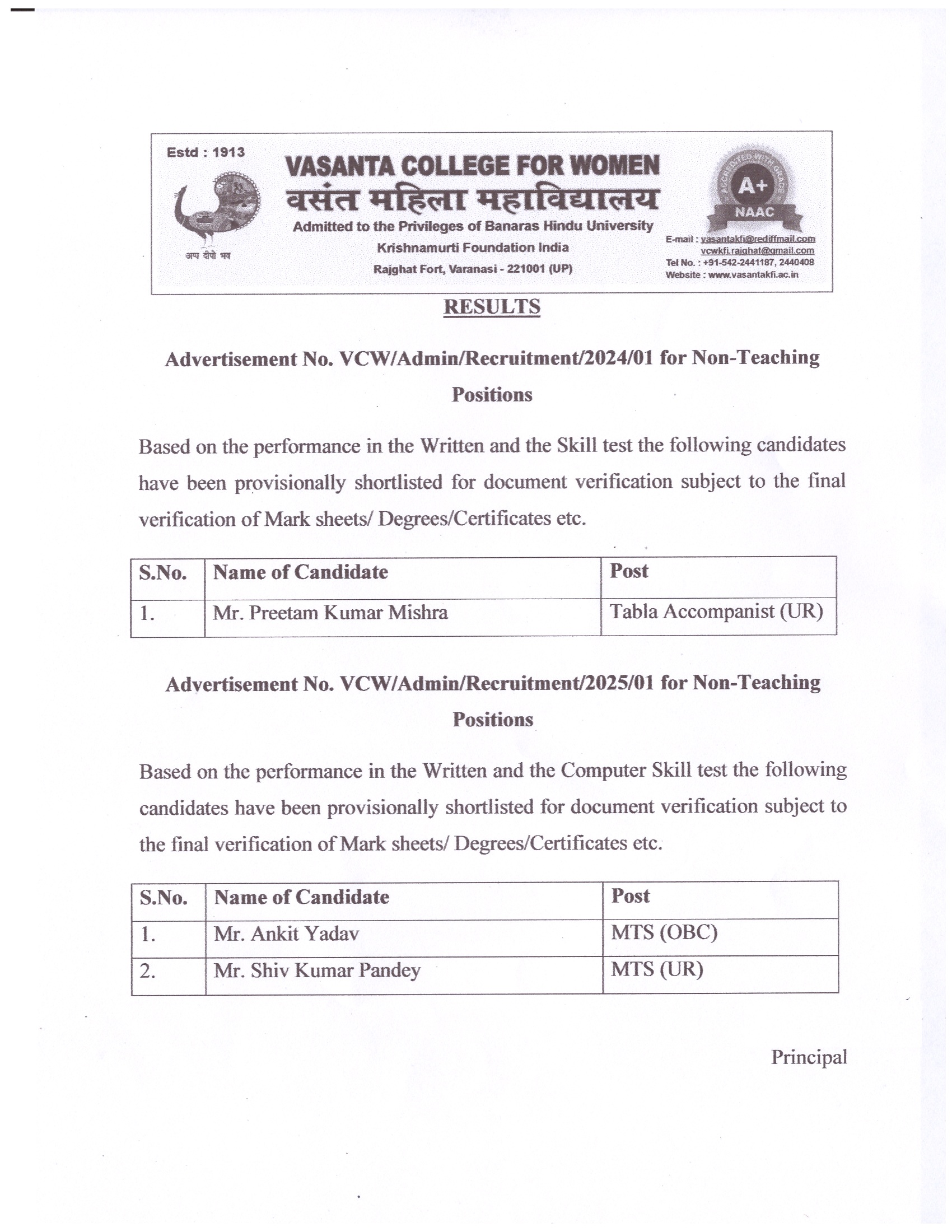| 21 | VCW/Admin/Recruitment/2024/01 | 13-02-2025 | Result for Non-Teaching Positions |